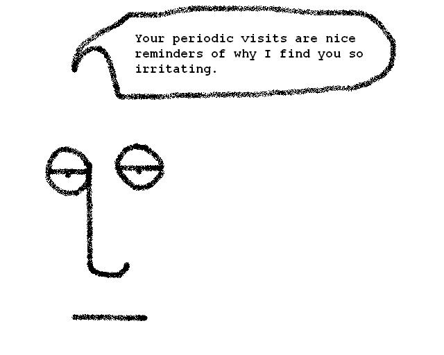 It’s Beneficial To See You Again Posted by quo1 on April 11, 2013 Posted in: Cartoon, Humor, Musings. Tagged: annoyance, conflict, family, irritation, Relationships. 3 Comments